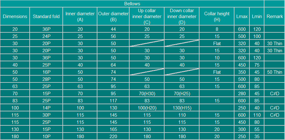 - Round rubber bellow is mainly application on ball screw, hydraulic cylinder, and any other axial moving element, it is also application on Electrical Discharge Machine very often. The purpose of installing round rubber bellow is to prevent oil and water going into axial moving element. Round rubber bellow is also suitable for long distance ball screw protection. In order to deliver it fast and on time to customers, we provide the standard table which are mostly in stock, customer can choose flange type, clamp type, inner diameter, outer diameter, etc. Round rubber bellows are also satisfactory in RoHS certification and can work under oil and high temperature occasion.
